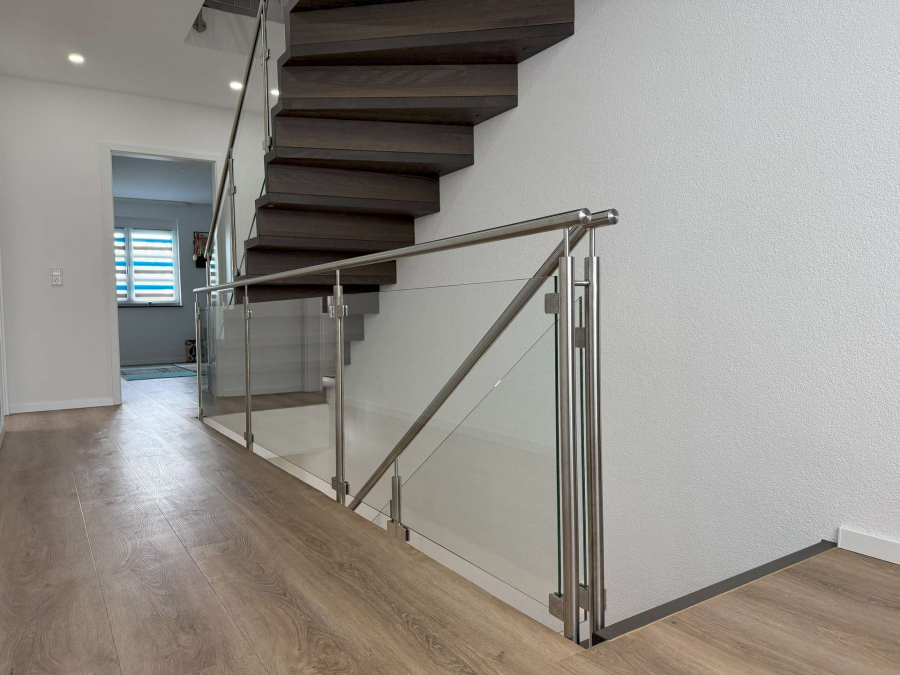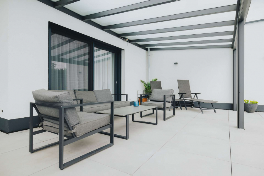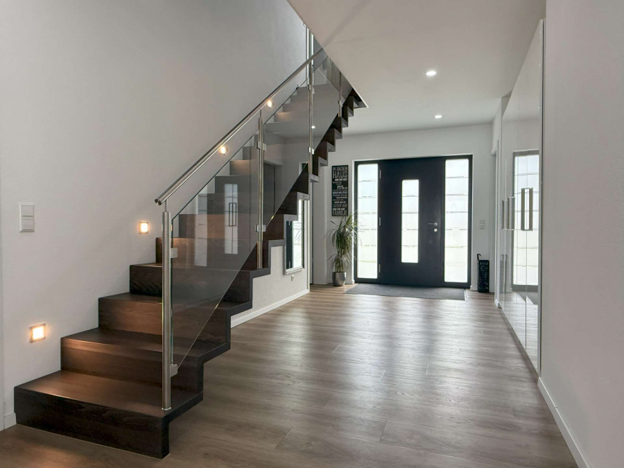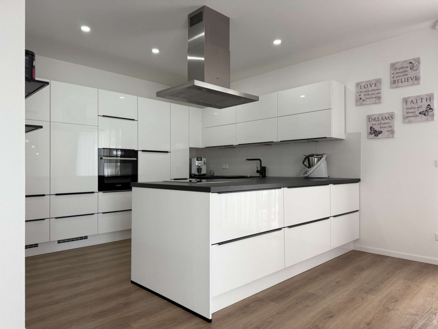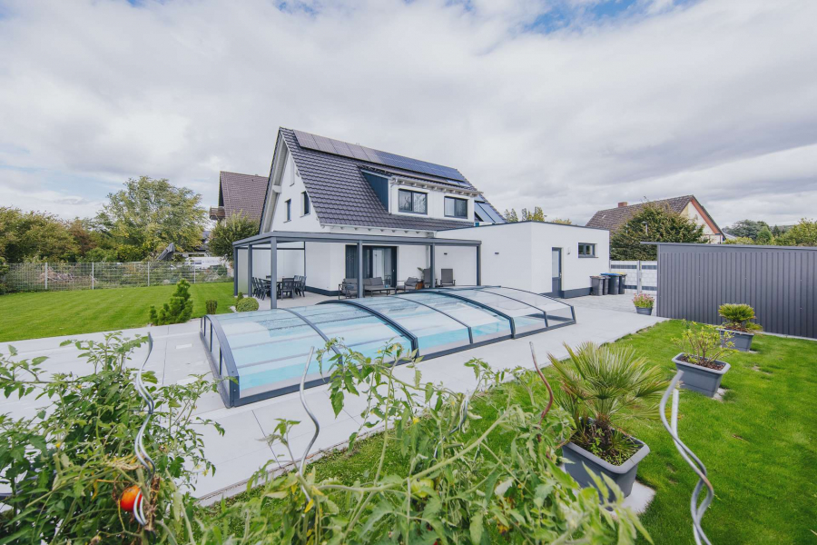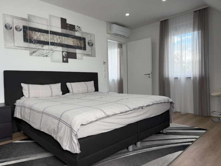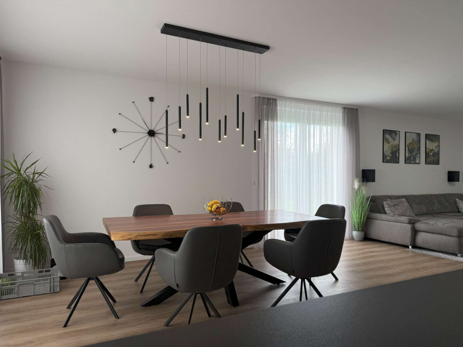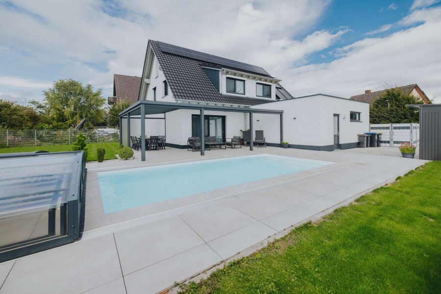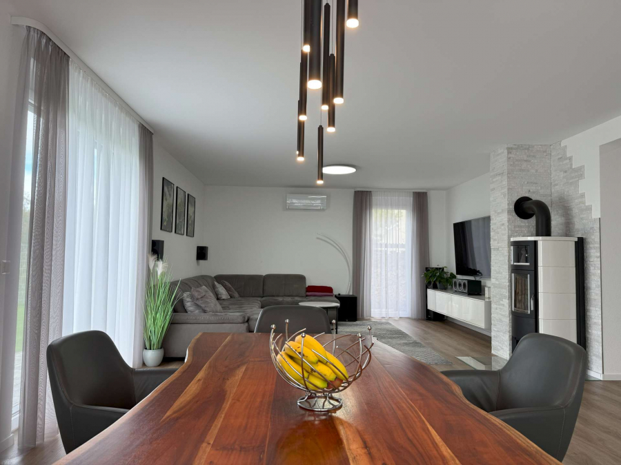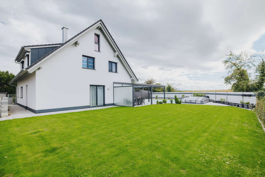 In ruhiger Ortsrandlage von Breisach-Oberrimsingen, angrenzend an landwirtschaftlich genutzte Flächen, präsentiert sich dieses moderne Einfamilienhaus aus dem Baujahr 2021 auf einem ca. 767 m² großen Grundstück. Die Gesamtwohnfläche beläuft sich auf ca. 203 m² und verteilt sich harmonisch über Erd- und Dachgeschoss. Im Erdgeschoss erstrecken sich ca. 98 m² Wohnfläche über einen großzügigen Wohn- und Essbereich mit Kamin. Von hier aus gelangen Sie in den großen Außenbereich mit überdachter Terasse und dem über eine Wärmepumpe beheizbaren Außenpool. Dürberhinaus erwartet Sie im Erdgeschoss die offene, hochwertige Einbauküche, ein Schlafzimmer/Büro sowie ein Badezimmer mit Dusche und integrierter Sauna. Ein Technik- und Waschraum von zusätzlich ca. 12 m² verbindet auf dieser Etage das Haus mit einem praktischen, direkten Zugang zur Doppelgarage. Das Dachgeschoss bietet ca. 105 m² Wohnfläche mit drei optimal geschnittenen Schlafzimmern und einem Tageslichtbad, ausgestattet mit Dusche und Badewanne. Vom Dachgeschoss aus ist der ausgebaute Dachspitz erreichbar. Dieser ist nicht in der Wohnfläche berücksichtigt und eignet sich ideal als Kellerersatz oder Hobbyraum.