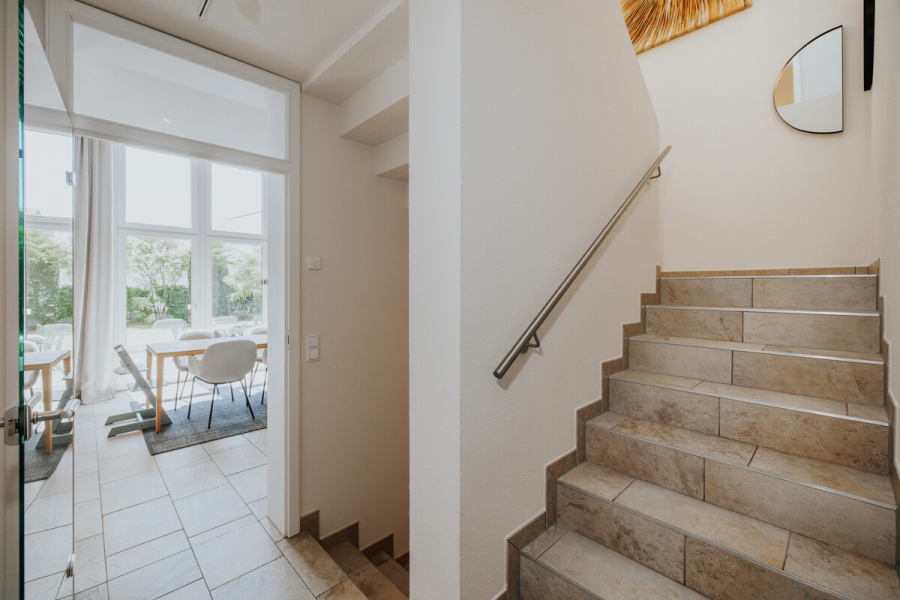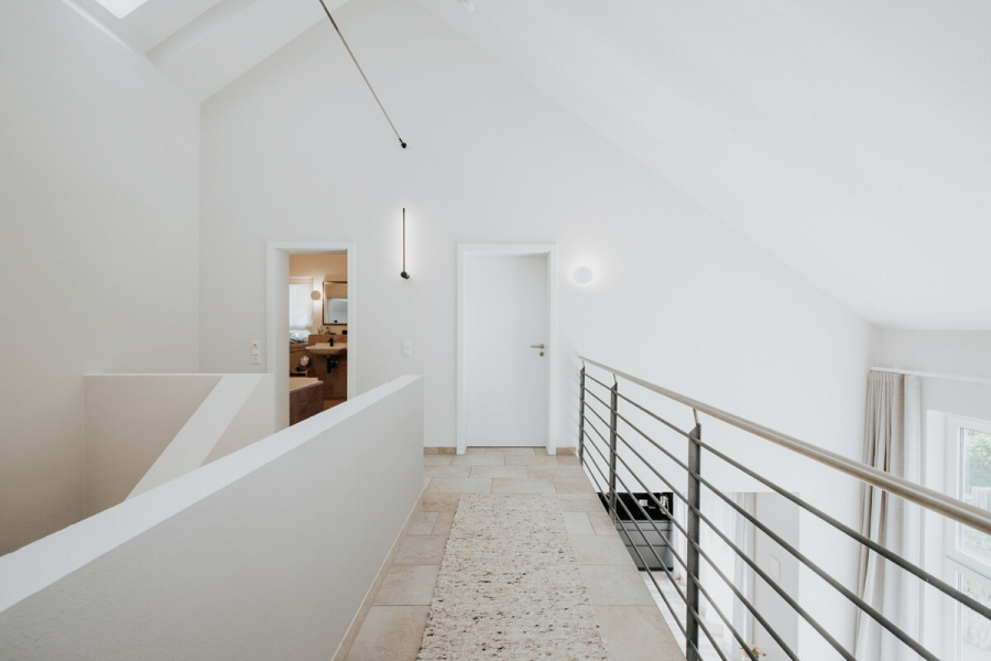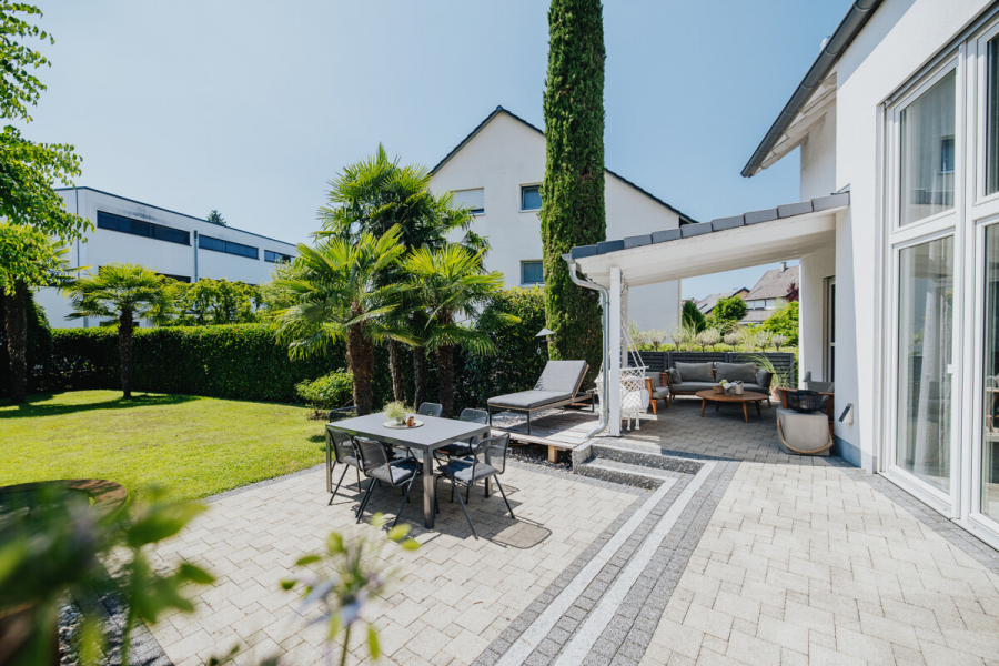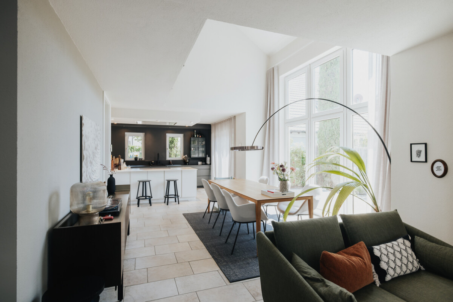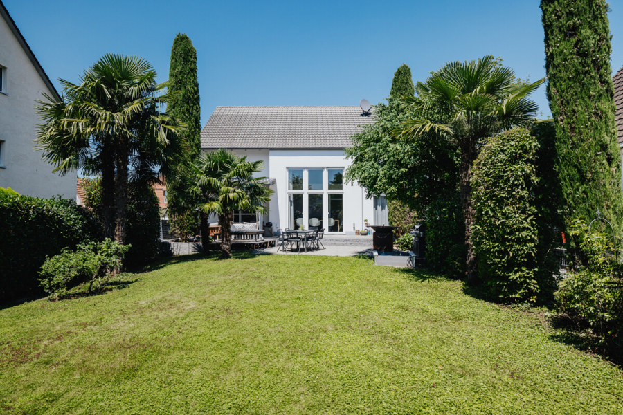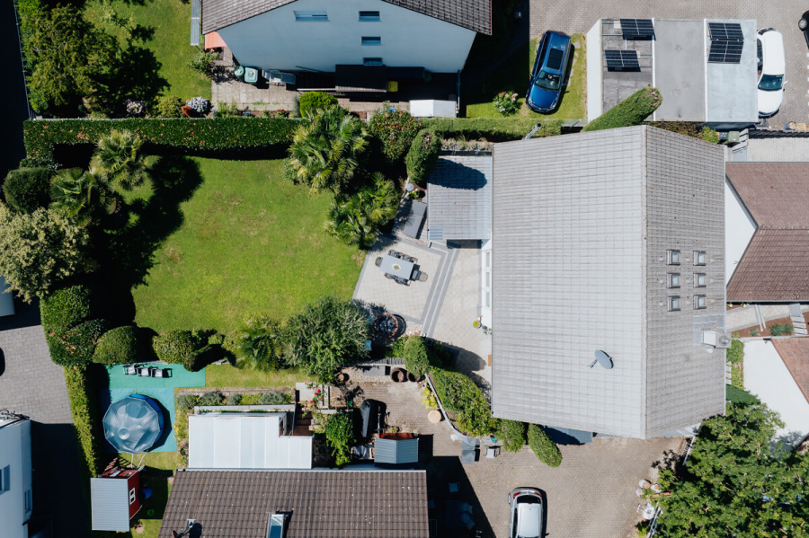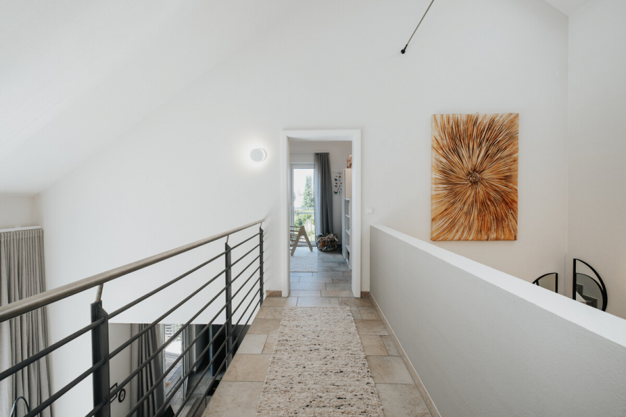 Im Herzen von Gundelfingen befindet sich dieses moderne Einfamilienhaus aus dem Baujahr ca. 2003, das auf einem knapp 596 m² großen Grundstück steht. Das Haus bietet insgesamt etwa 157 m² Wohnfläche, verteilt auf fünf Zimmer im Erd- sowie im Dachgeschoss. Im Erdgeschoss beeindruckt der offen gestaltete Wohn- und Essbereich mit integrierter Küche, der durch die Südausrichtung und die großen Fensterflächen besonders lichtdurchflutet ist. Die offene Galerie und die hohen Räume tragen zusätzlich zu einem großzügigen Raumgefühl bei. In dieser Etage befinden sich außerdem eine geräumige Diele mit praktischen Einbauschränken sowie ein separates WC. Das Hauptbad, ausgestattet mit Badewanne und bodengleicher Dusche, liegt im Dachgeschoss zusammen mit den drei Schlafzimmern des Hauses sowie einem Ankleidezimmer. Im Untergeschoss wurde kürzlich ein weiteres Schlafzimmer mit Bad en Suite ausgebaut. Hier finden sich außerdem ein Hobbyraum sowie zwei Kellerräume inklusive Waschküche. Den Abschluss bildet der idyllische, schön angelegte Garten auf der Rückseite des Hauses, der zum Verweilen und Entspannen einlädt und die Liegenschaft perfekt abrundet.