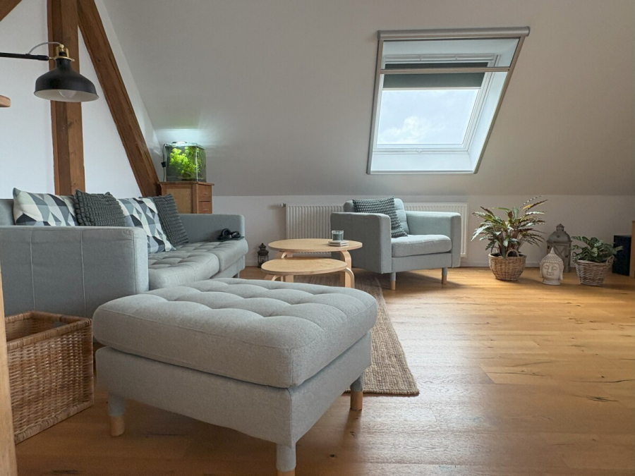 Am Ortseingang von Vogtsburg-Bickensohl befindet sich dieses ca. 1979 erbaute Zweifamilienhaus auf einem rund 743 m² großen Erbbaurechtsgrundstück. Die zum Verkauf stehende Dachgeschosswohnung ist noch bis zum 31.03.2026 vermietet und erzielt eine Kaltmiete von 1.150,00 EUR pro Monat. Ab dem 01.04.2026 steht die Wohnung zur Eigennutzung oder Neuvermietung frei. Insgesamt ca. 83 m² Wohnfläche verteilen sich auf einen lichtdurchfluteten, offenen Wohn- und Essbereich mit Küche und direktem Zugang zum Balkon, zwei Schlafzimmer, einen praktischen Abstellraum sowie ein Tageslichtbad mit Badewanne und Dusche. Zur Wohnung gehören Sondernutzungsrechte am Dachspitz, an einem Hobbyraum im Untergeschoss, an einer KFZ-Stellfläche sowie an einem Gartenbereich an der Eingangsseite des Hauses. Der Erbbaurechtsvertrag mit der Stiftung Schönau läuft noch weitere 53 Jahre, der Erbbauzins beträgt seit dem 11.11.2025 jährlich 585,60 EUR. Die Eigentümergemeinschaft verwaltet sich selbstständig, ohne eine externe Hausverwaltung.